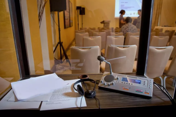 We handle projections, PA systems, booths, headsets, receivers, and streaming links so everyone hears in their language—on site and online.